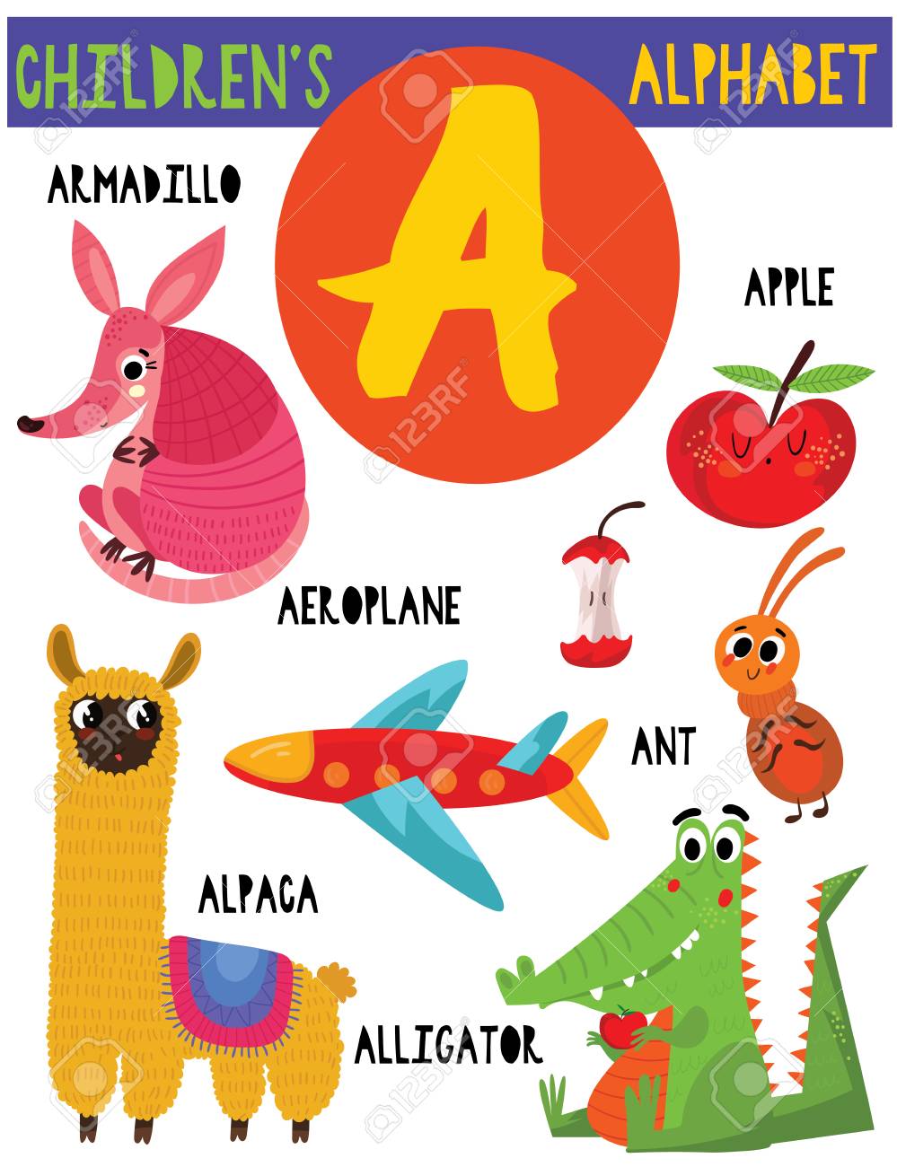 Letter A Cute Children S Alphabet With Adorable Animals And Other Things Poster For Kids Learning English Vocabulary Cartoon Vector Illustration Royalty Free Svg Cliparts Vectors And Stock Illustration Image 127312762
